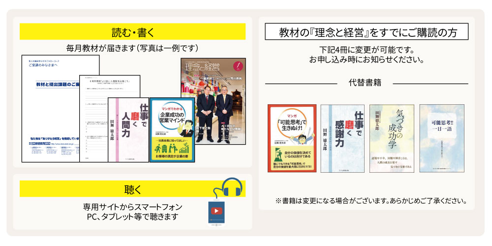 教材には、月刊『理念と経営』や課題図書、レポート記入、そして仕事に関する心構えや社会人にとって重要な事柄を収録した講師メッセージがあります。セミナーだけでなく、日々の生活の中で、「報告・連絡・相談・確認」「課題提出による期限厳守」など、多くの学びを得ることができます。