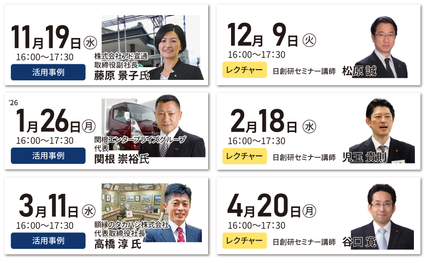 | 2026年3月開催 | 2026年3月11日(水)活用事例 【講師】額縁のタカハシ株式会社 代表取締役社長 高橋 淳 氏  |