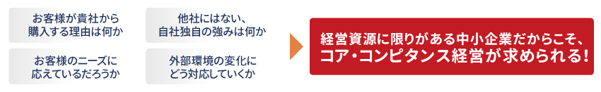 私たち中小企業にとって、ますます厳しい時代を迎えようとしています。新たな時代をたくましく生き残っていくためには、中長期を見据えた顧客視点の「成功戦略」が必要です。どの業界も顧客の価値観が大きく変わる中で、顧客に真の価値をもたらすことのできる「コア・コンピタンス」が必須の条件になってきました。