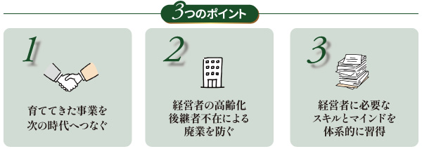 このプログラムは、後継者不在率が約60%とも言われる中小企業の後継者問題に対して、立派な次世代経営者の育成を実現します。