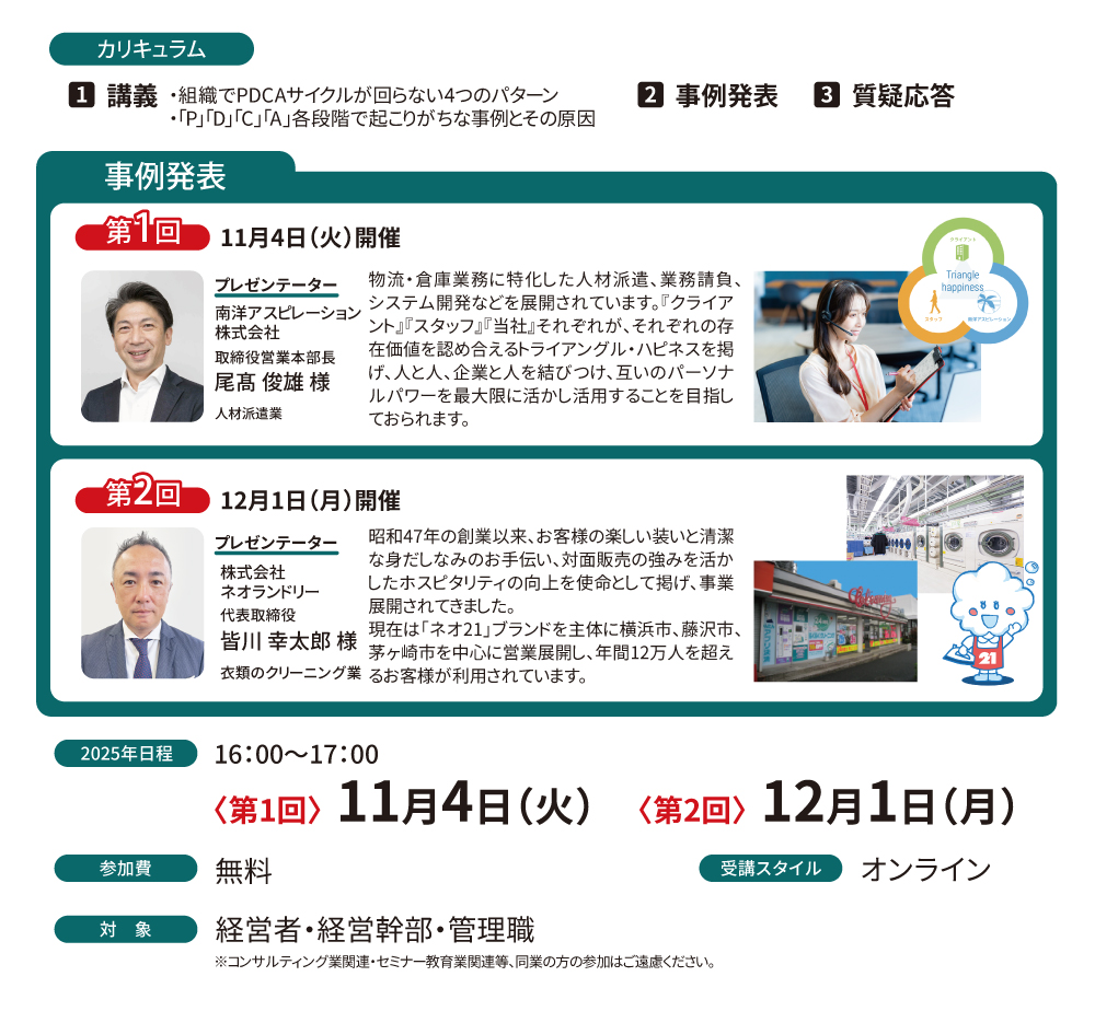 私たちを取り巻く経営環境は激変しています。環境変化に合わせた仕事の改善・改革や、結果をつくる人材の育成方法など、マネジメントに必要なスキルや知識を身につけることができる「マネジメント養成6か月コース」の説明会を開催いたします。オンラインでどなたでも無料でご参加いただけます。是非ご参加ください!