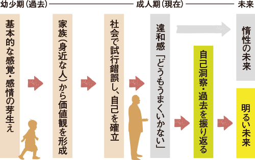 「過去」を振り返り、「現在」を観察し「未来」の新たな自分を築きます。これまでのさまざまな体験や生い立ちから、現在置かれている状況を見直し、自らの価値観、考えなどを深く再認識し、未来にどのような人生を創造するかを明確にしていきます。